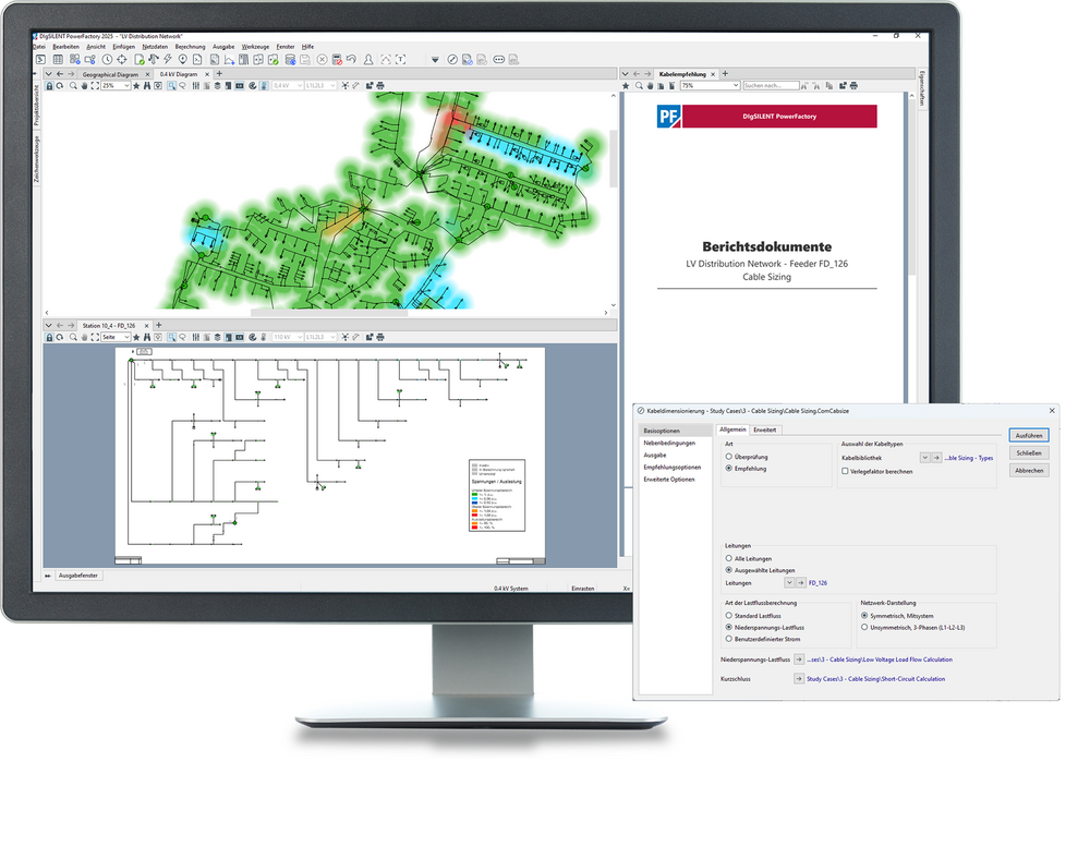 - Verschiedene Ergebnisberichte und automatisches Modifizieren der Kabeltypen im existierenden Netz oder durch Erzeugen einer neuen Variante