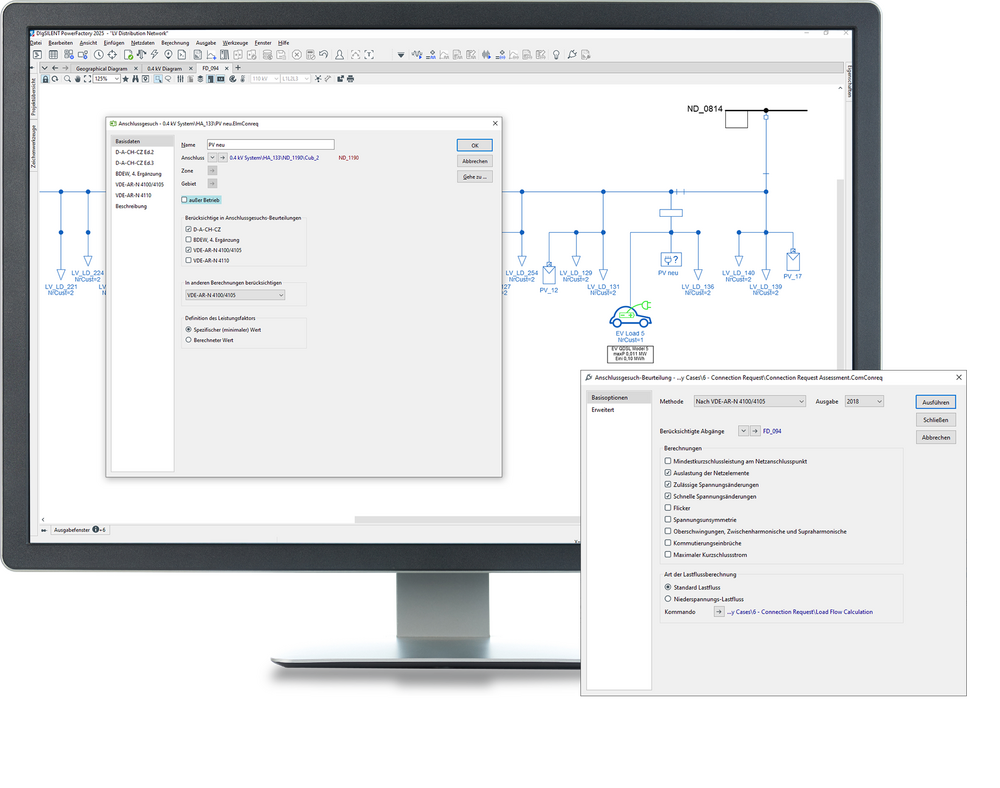 Mit dieser speziellen Funktion, die die Richtlinien D-A-CH-CZ, BDEW und VDE-AR-N 4105/4100/4110 unterstützt, wird die Bewertung von Anschlussgesuchen vereinfacht. Die Eingabe für den Anschlussgesuch-Befehl erfolgt über ein Anschlussgesuch-Element, das entsprechend den gelieferten Daten konfiguriert wird. Der Ausgabebericht zeigt Ergebnisse wie Spannungsänderungen, Flicker und Oberschwingungen an und überprüft die Einhaltung der gewählten Richtlinie.
