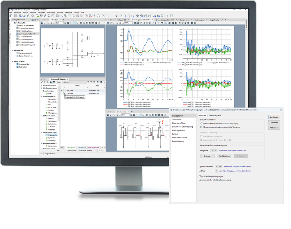 - Integrierte Simulation von elektromagnetischen Vorgängen (Momentanwert-Simulation) in mehrphasigen AC- und DC-Systemen