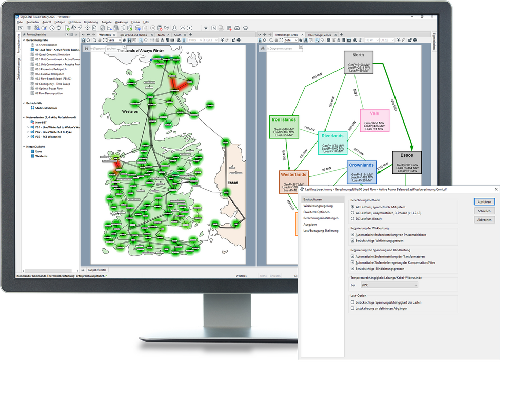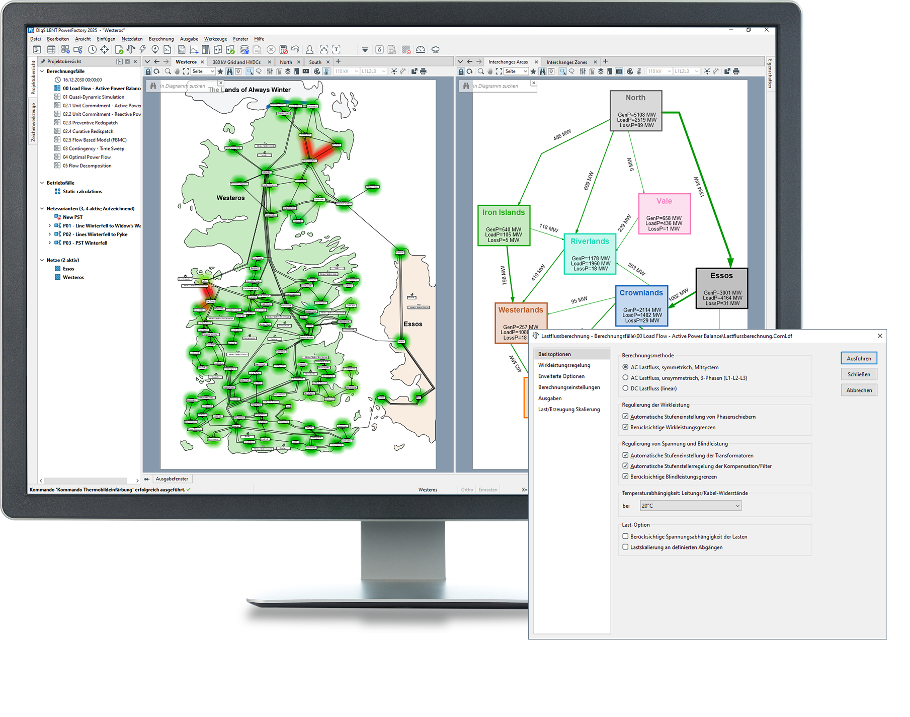 Die Lastflussberechnung ist die stationäre Analyse eines Stromversorgungsnetzes und bildet den Ausgangspunkt für viele andere Berechnungsfunktionen in PowerFactory. Die iterative AC-Methode, sowohl für symmetrische als auch für unsymmetrische Netze, verwendet einen verbesserten, nicht entkoppelten Newton-Raphson-Algorithmus. Der auf Stabilität und Konvergenz optimierte Algorithmus führt zusammen mit den vielfältigen Befehlsoptionen und den hochentwickelten Reglermodellen zu einer genauen und zuverlässigen Lösung. Die lineare DC-Methode, welche Wirkleistungsflüsse und Spannungswinkel löst, ist eine extrem schnelle und robuste Alternative.
