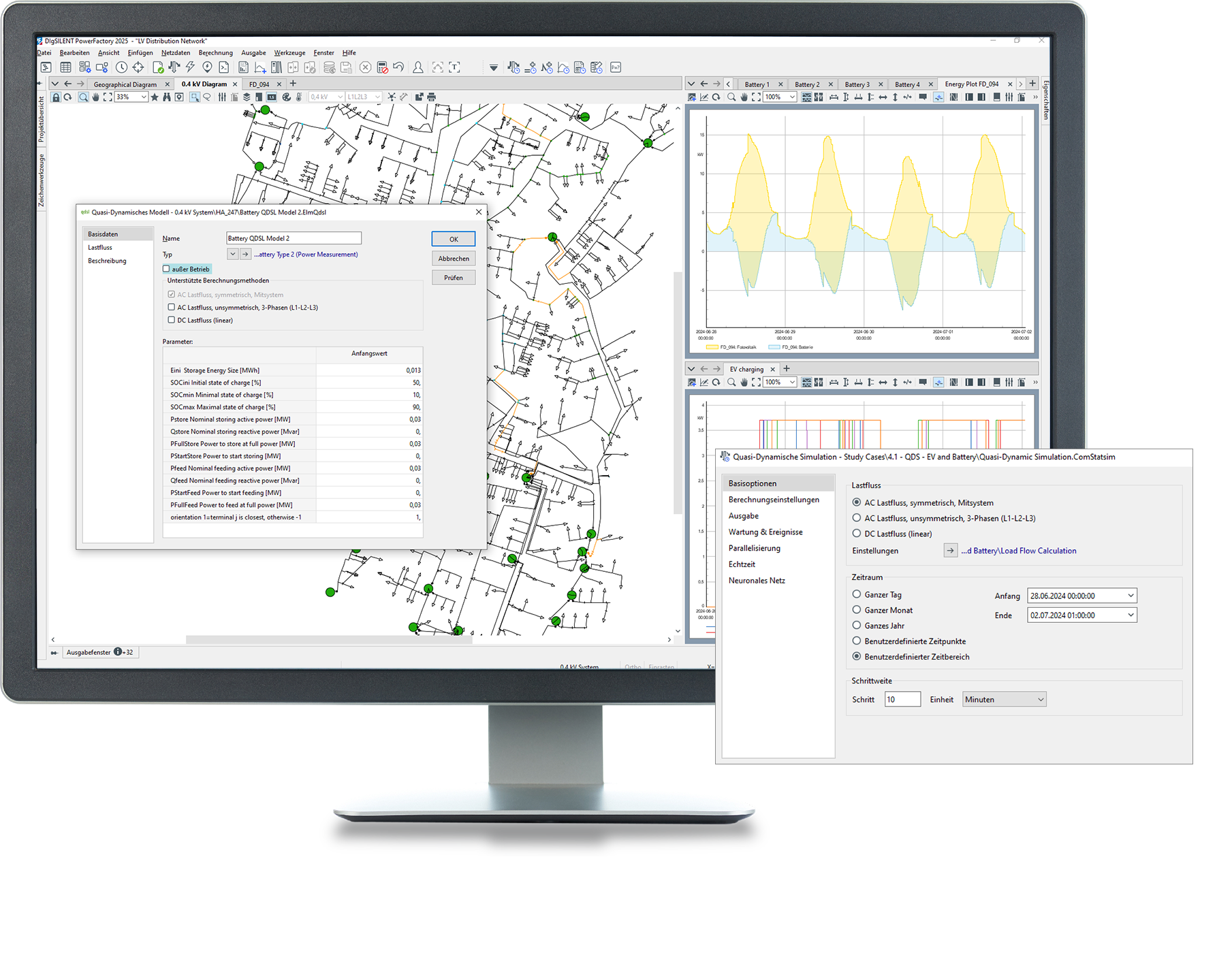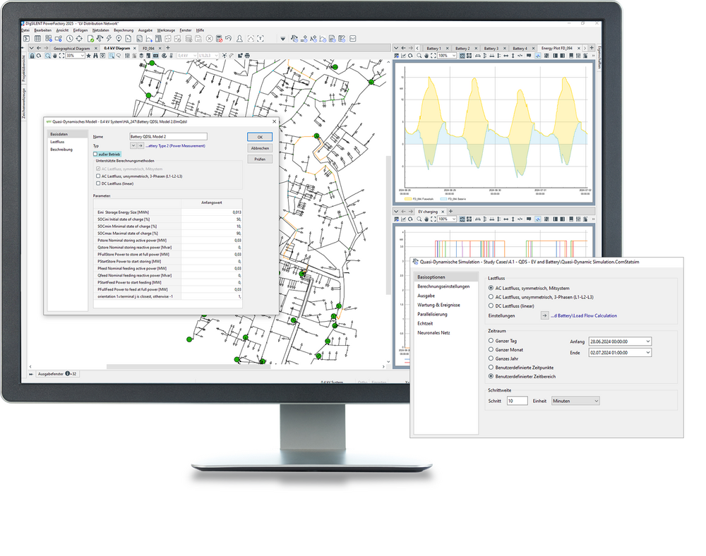 - Berechnung von (AC oder DC) Lastfluss, Kurzschluss und dynamischen Äquivalenten