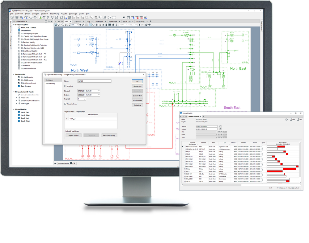 Das PowerFactory-Werkzeug für das Abschaltungsmanagement ermöglicht die einfache Anwendung und Rücksetzung zeitlich geplanter Anlagenausfälle. Abschaltungen können zugehörige Systemmaßnahmen wie die Neukonfiguration von Umspannwerken oder das Lastmanagement einschließen., Die Funktion umfasst zudem eine grafische Visualisierung und tabellarische Berichte.