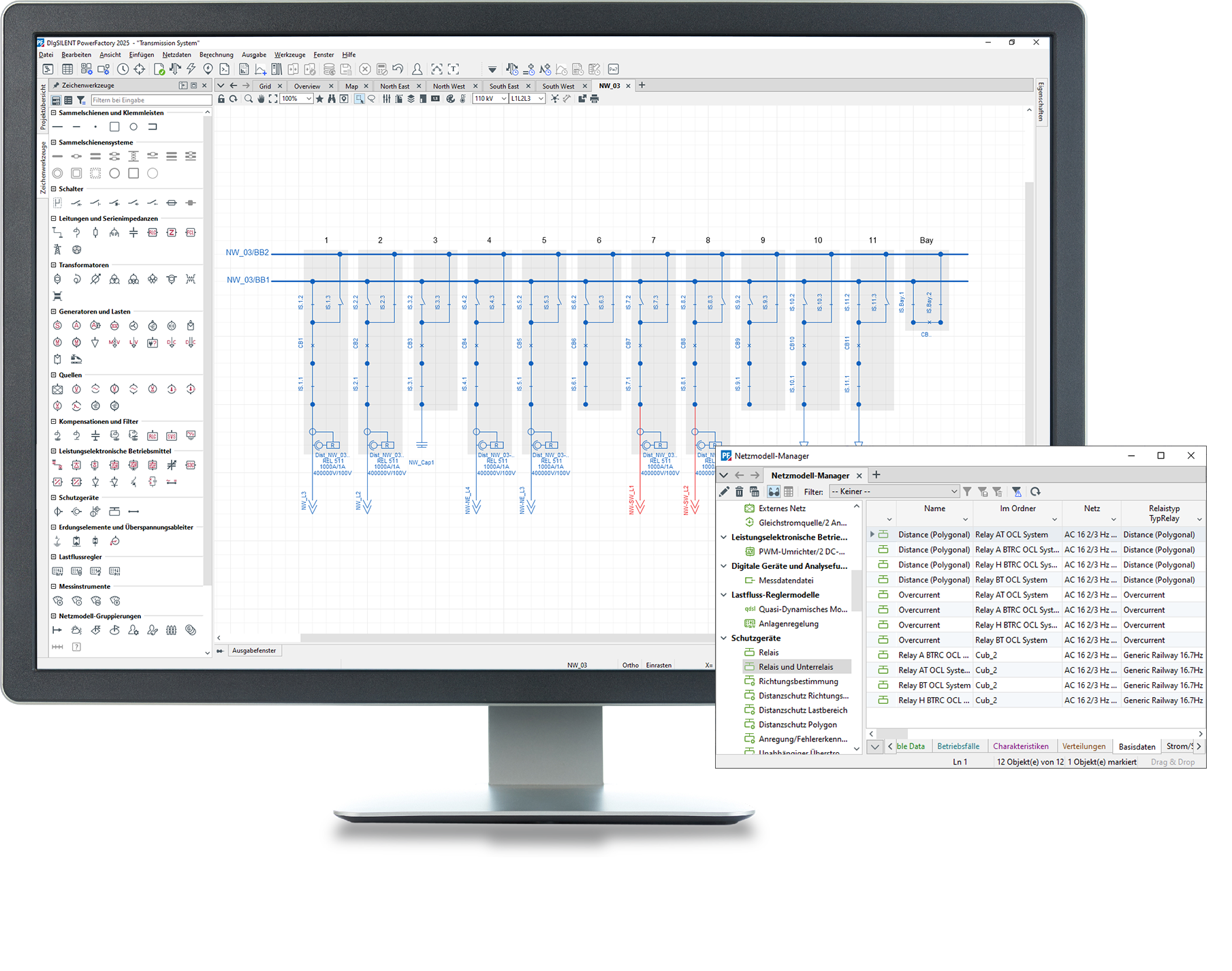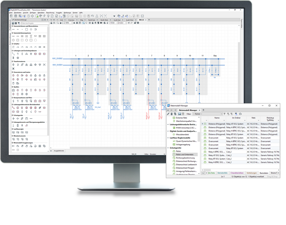 - Schutzgeräte: hochgradig anpassbare Schutzrelais mit ca. 30 grundlegenden Schutzfunktionsblöcken, umfassende Bibliothek für Relais, Sicherungen und NS-LS Auslöse-Einheit für stationäre und dynamische Berechnungen. Weitere Details im Abschnitt "Schutzfunktionen"