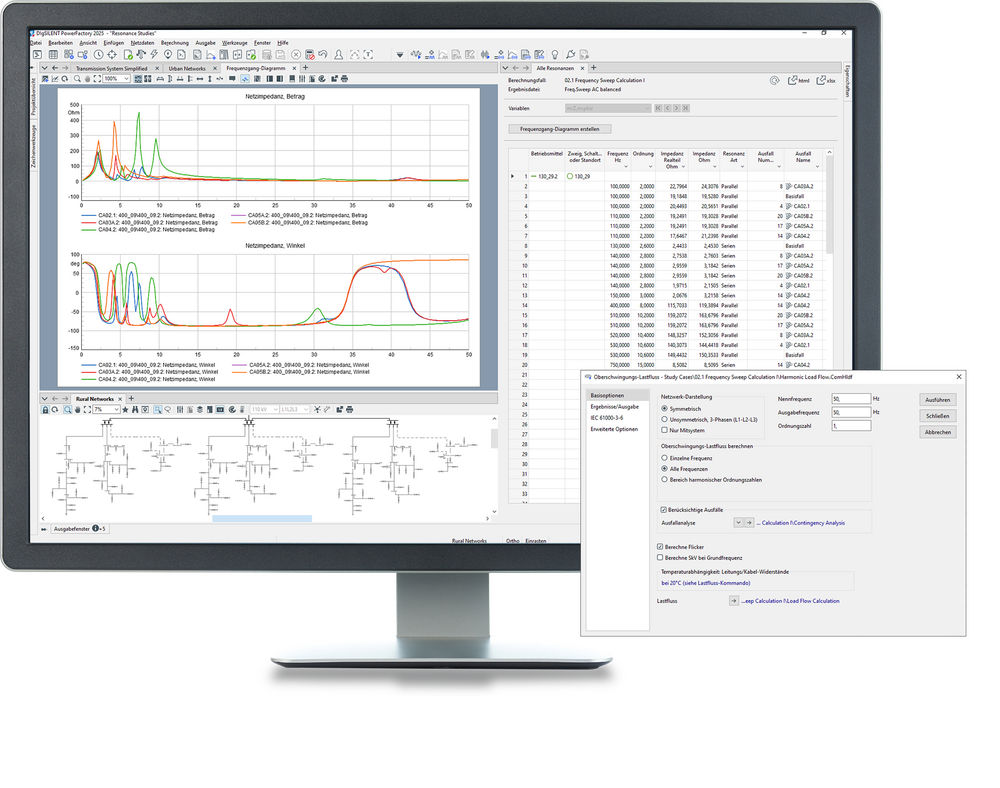 Mit der Oberschwingungslastflussberechnung und der Frequenzgang-Berechnung kann der Benutzer das modellierte Netz im Frequenzbereich analysieren. Auch ungeplante Ausfälle können berücksichtigt werden. Das Modul umfasst auch Funktionen zur Flicker-Analyse und Filter-Analyse.