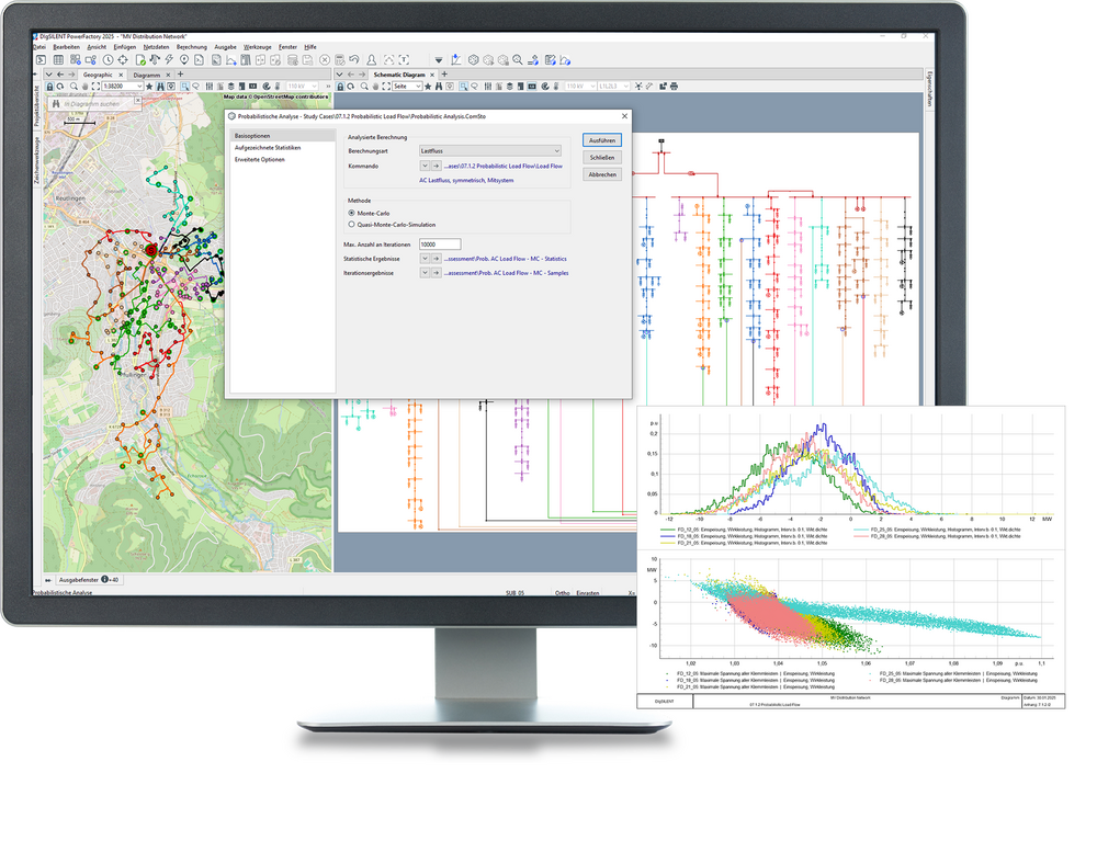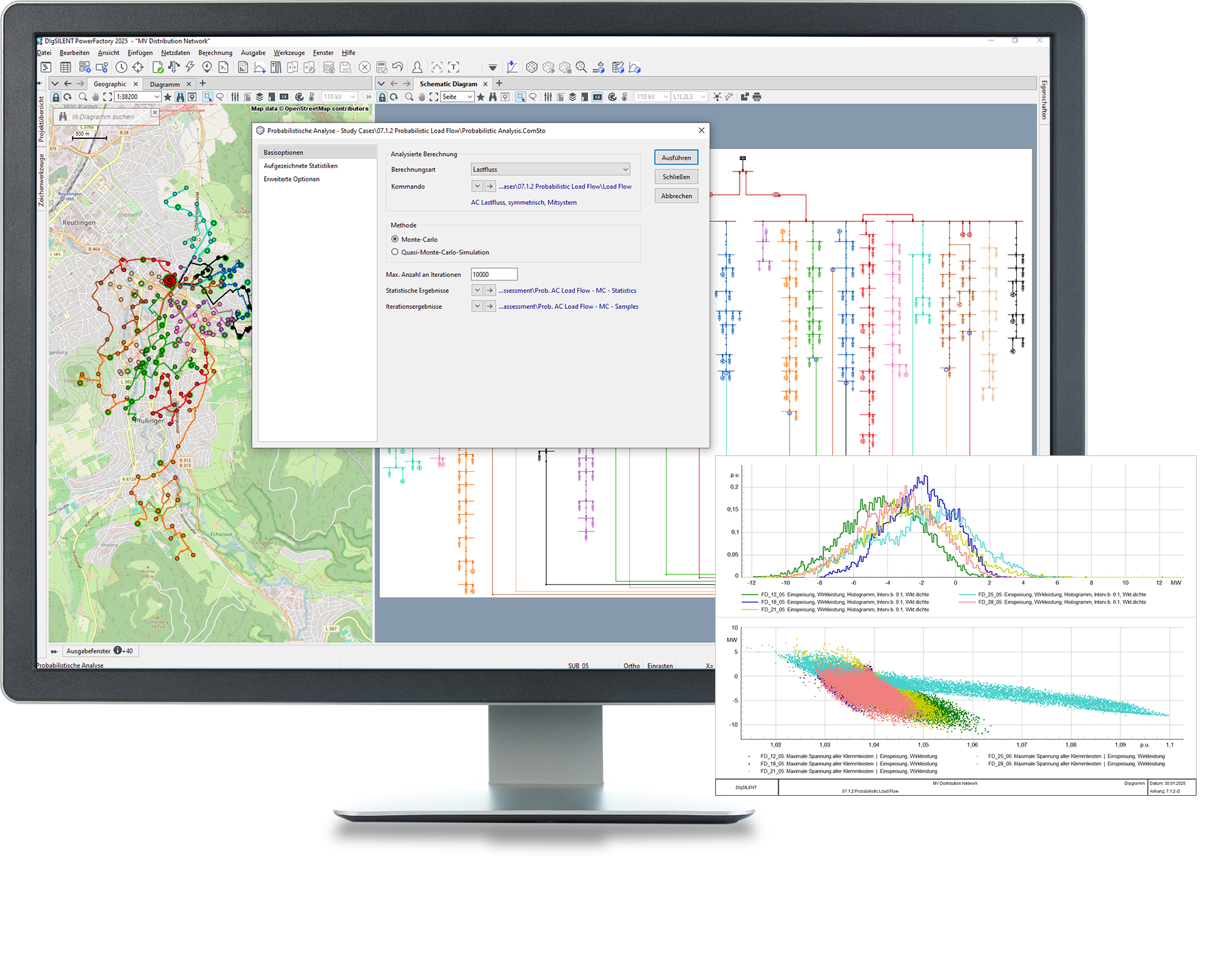 Anstatt einzelne Betriebsfälle oder Zeitreihen auszuwerten, ermöglicht die Funktion der Probabilistischen Analyse eine Bewertung des Netzes auf der Grundlage von probabilistischen Eingabedaten. Diese Funktionalität wird wichtig, sobald Eingabeparameter als zufällig gewählt bekannt sind oder wenn der Anwender das Netz zu irgendeinem Zeitpunkt in der Zukunft mit Vorhersagefehlern simulieren möchte.