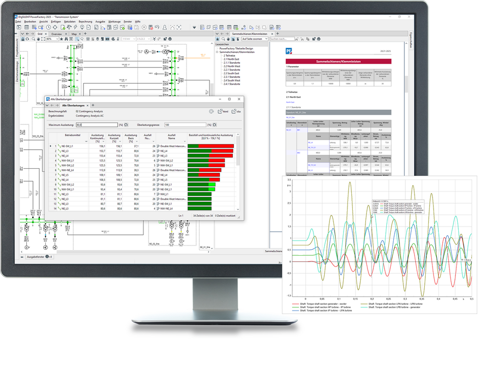 - Zahlreiche interaktive Diagramme zur Ergebnisdarstellung (Schutz, Oberschwingungen, RMS- und EMT-Simulationskurven, Eigenwert-Berechnungen, etc.)