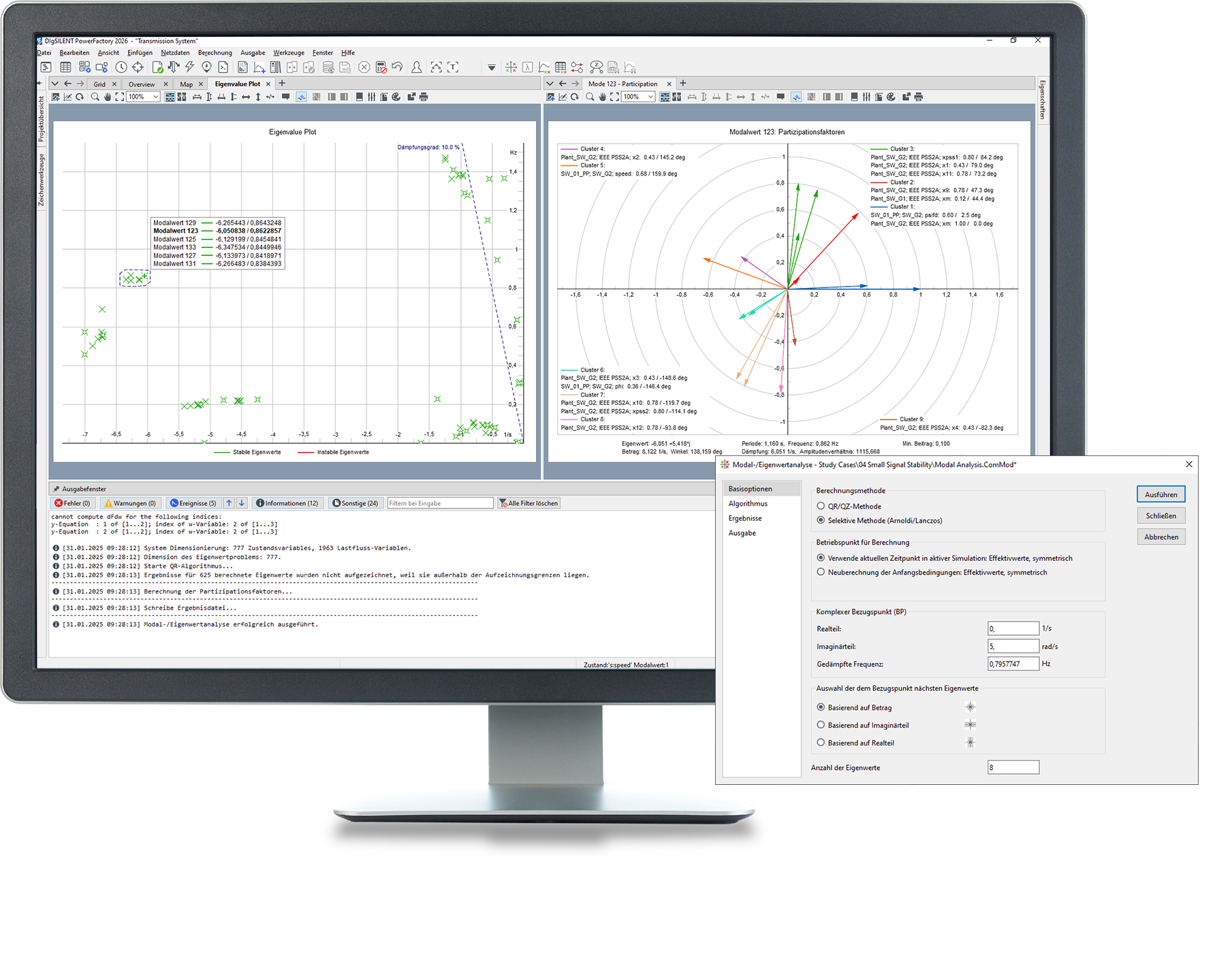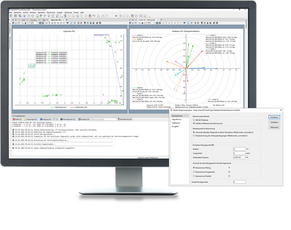 Das PowerFactory Modul Funktionen zur Kleinsignalstabilität bietet ein Eigenwertanalyse-Funktion, das sowohl für symmetrische als auch für unsymmetrische Netzdarstellungen geeignet ist. Dieses kann so konfiguriert werden, dass alle Schwingungsmoden im System berücksichtigt werden oder aber eine selektive Analyse (die besonders in großen Netzen hilfreich ist) durchgeführt wird. Dabei wird nicht nur die konventionelle Erzeugung, sondern auch die nicht konventionelle Erzeugung durch Windenergieanlagen, PV-Anlagen und HGÜ berücksichtigt. Die Ergebnisse können in einem Eigenwertdiagramm oder in tabellarischen Berichten dargestellt werden, die alle relevanten Informationen wie beispielsweise Schwingungsfrequenz, Dämpfung und Dämpfungsverhältnis beinhalten. Darüber hinaus können die Partizipationsfaktoren der Zustandsgrößen, die Beobachtbarkeit (rechte Eigenvektoren) und die Regelbarkeit (linke Eigenvektoren) in Balken- und Zeigerdiagrammen dargestellt werden.
