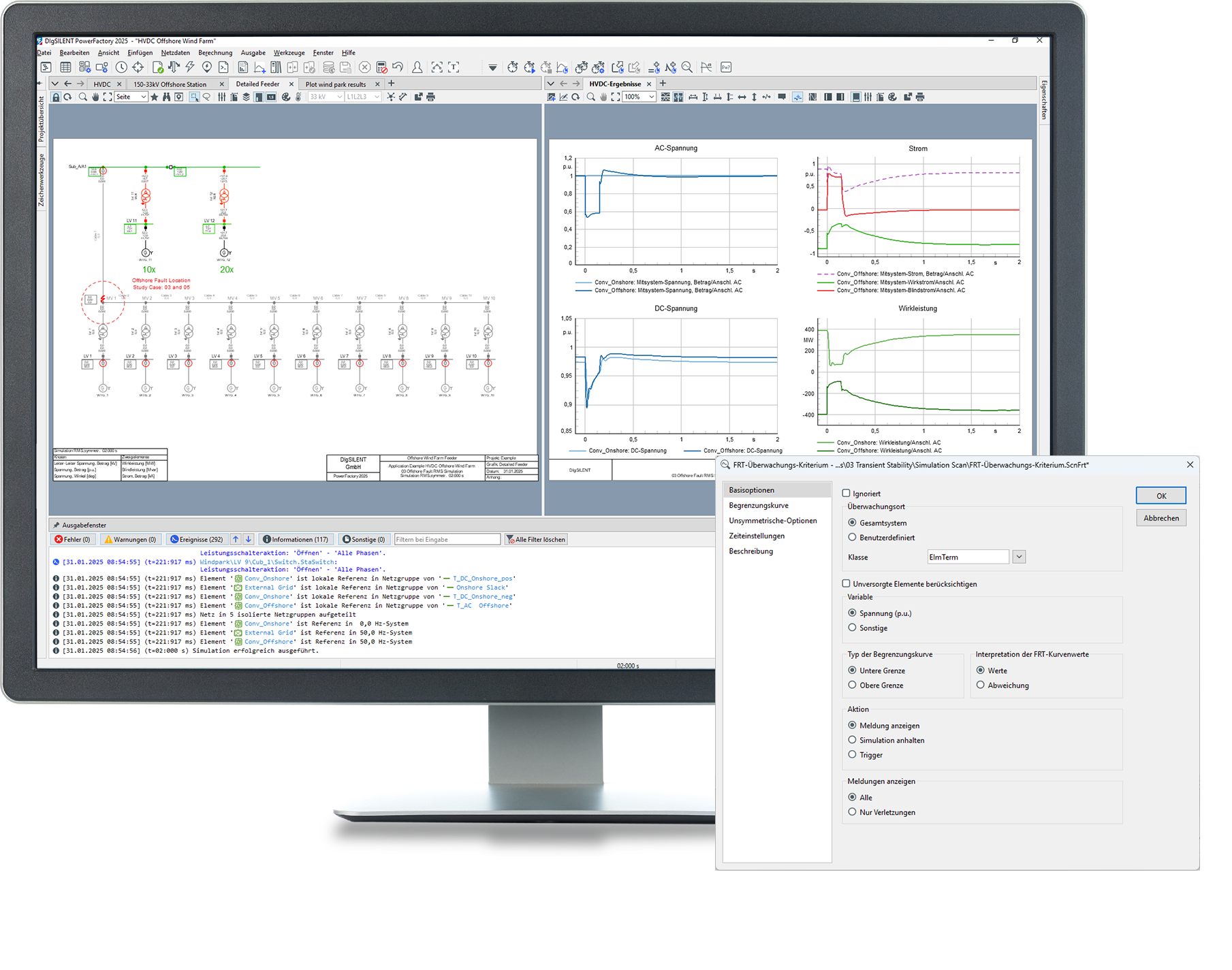 Das Tool 'RMS-Simulation' in PowerFactory, das eine Simulationsüberwachungsfunktion beinhaltet, kann zur Analyse von Mittelzeit- und Langzeit-Vorgängen sowohl im symmetrischen als auch im unsymmetrischen Zustand verwendet werden. Eine umfangreiche Bibliothek von Standardmodellen (z. B. IEEE) ist enthalten, und grafische Umgebungen erleichtern die Erstellung von benutzerdefinierten Modellen mit DSL (DIgSILENT Simulation Language) oder Modelica. Schnittstellen ermöglichen den Import und Export von Modellen, und flexible Co-Simulationsoptionen sind ebenfalls verfügbar.