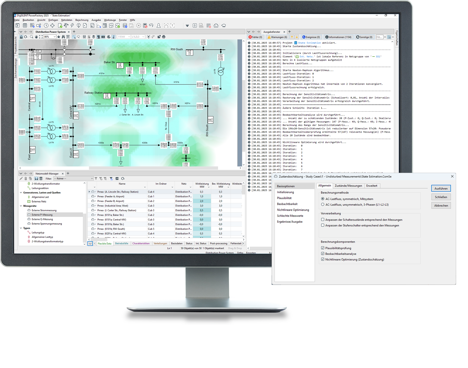 Die Zustandsschätzung ist eine Methode zur Bestimmung des wahrscheinlichsten Zustands eines Netzes auf der Grundlage von Messdaten und Netztopologie. Die Zustandsschätzung in PowerFactory ist sowohl für symmetrische als auch für unsymmetrische Netze verfügbar und umfasst eine Plausibilitätsprüfung, um schlechte Daten zu eliminieren, sowie eine Beobachtbarkeitsanalyse, um zu überprüfen, ob die Messungen im System genügend (nicht redundante) Informationen liefern, um den Zustand dieses Teils des Netzes zu schätzen. Optionen für die Behandlung nicht beobachtbarer Bereiche ermöglichen eine verbesserte Schätzung des Netzzustands.