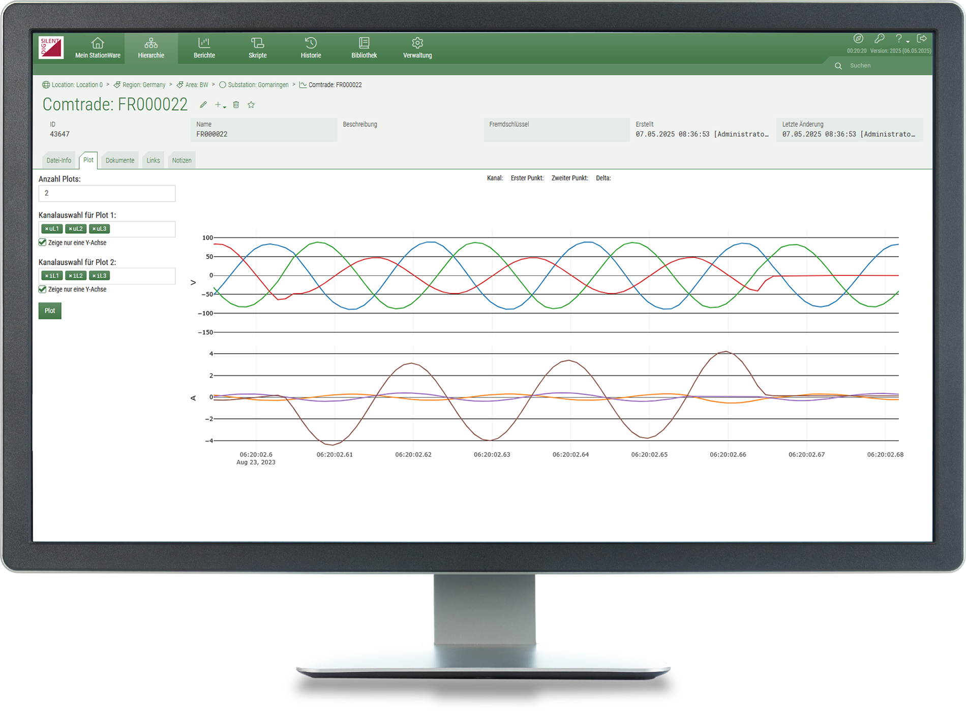 Die Verwaltung von COMTRADE-Dateien basiert auf dem COMTRADE-Objekt. Es speichert die Konfigurations- und binären oder ASCII-formatierten Datendateien und liest und zeigt die Informationen der COMTRADE-Kopfzeile an. Die StationWare COMTRADE-Funktionalität unterstützt den COMTRADE-Standard IEEE37.111, 1991 und 2013. Die in der COMTRADE-Datei gespeicherten analogen und digitalen Messdaten können in Diagrammen als Funktion der Zeit dargestellt werden. Die Diagramme unterstützen verschiedene Funktionalitäten wie Zoomen, Skalieren, Verschieben und die Anzeige von Messwerten.