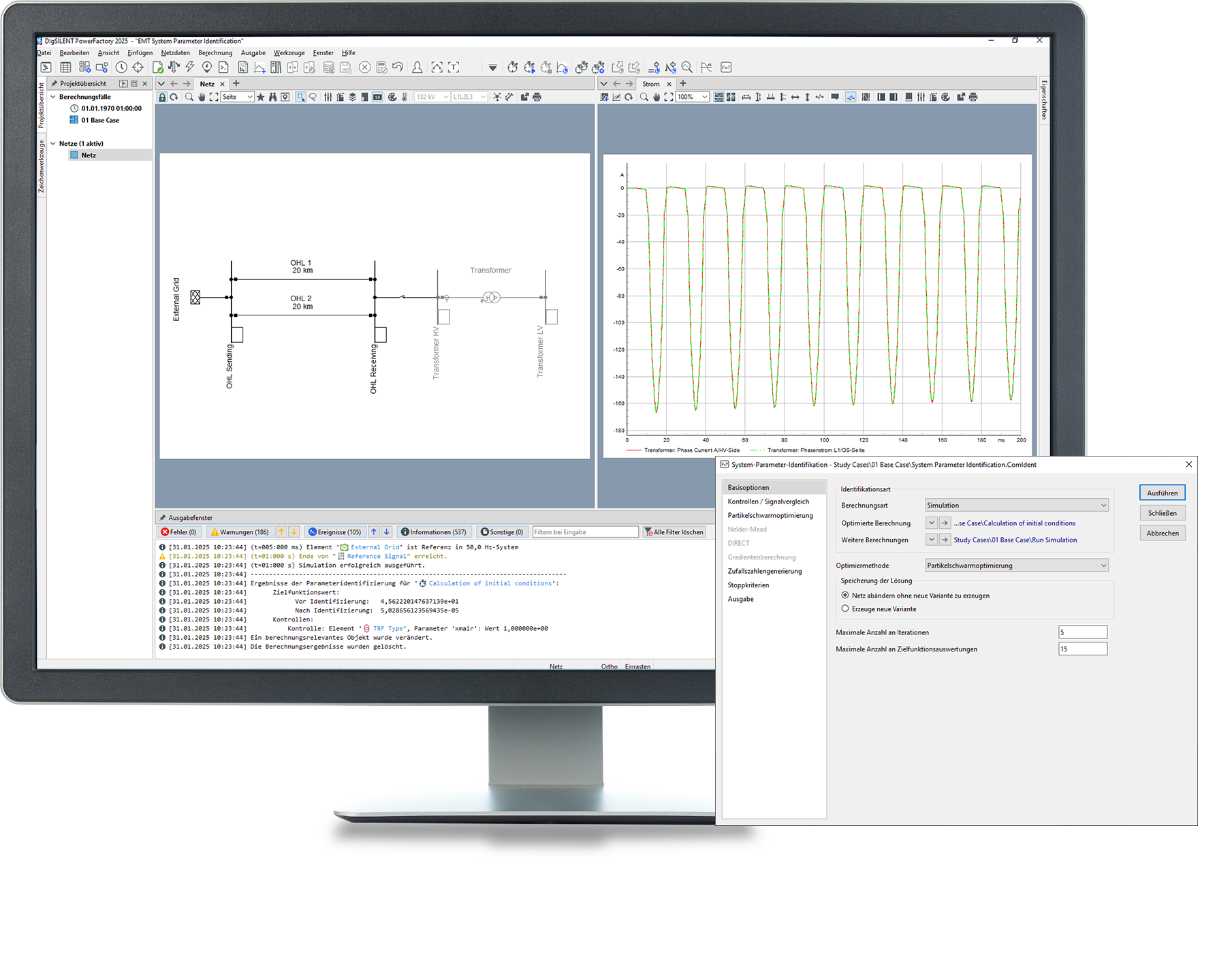 Die System-Parameter-Identifikation von PowerFactory ist ein Werkzeug zur Bestimmung unbekannter Parameter eines Modells auf der Grundlage einer Reihe von gemessenen Eingangs- und Ausgangssignalen. Diese Prozeduren sind für Lastflussmodelle ebenso geeignet wie für Modelle der Zeitbereichssimulation und in der Lage, mehrere Parameter auf einmal zu ermitteln, wobei für jeden Parameter optional auch Nebenbedingungen (nur Mitsystem) berücksichtigt werden können. Auch sind sie vollständig in die grafische Frame-Definition und das Blockschaltbild eingebunden. Die verfügbaren Optimierungsprozeduren sind in hohem Maße generisch und können auch zur optimalen Feinabstimmung von Parametern verwendet werden, wie etwa zur Einstellung von Pendeldämpfungsgeräten (PSS) entsprechend den definierten Antwortfunktionen eines Modells.
