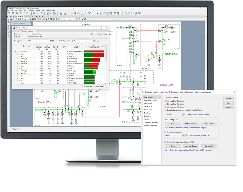 The Contingency Analysis tool in PowerFactory offers a high degree of flexibility in configuration, calculation methods and reporting options. Contingency fault cases can be generated automatically or created and modified by the user. Single- and multiple-time-phase contingency analyses are available, both of which take into account controller time constants and thermal (short-term) ratings.