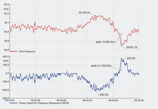 As well as providing the VT and CT signals from the point of connection, the PFM300-GCC offers monitoring of the plant status. In the case shown below, plant signals relating to the frequency response of the Battery Energy Storage Systems (BESS) and the pv generator are also evaluated. For other systems, turbine or governor signals can be recorded and included in the Grid Code Compliance Monitoring analysis, to check for compliance with the ramp rate control and frequency response settings. Similarly, voltage set points, dynamically changed by the network operator, can be monitored together with AVR signals.