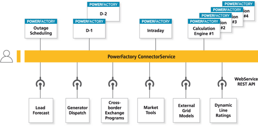 The PowerFactory ConnectorService is an ASP.NET Core based Windows Service that allows the user to configure, execute and observe processes running in PowerFactory. It uses a flexible plugin concept: standard or customer-specific plugins are combined and made available to the ConnectorService, so as to meet the needs of the individual customer. The External Application communicates with the ConnectorService e.g. via RESTful API. The ConnectorService component provides access to multiple PowerFactory engines via web services. Built-in queuing and scheduling makes it easy to integrate the PowerFactory engine with other applications. The ConnectorService comes with standard visualisation tools. The status of both the PowerFactory instances and the individual processes as well as additional information, such as calculation results can be monitored.