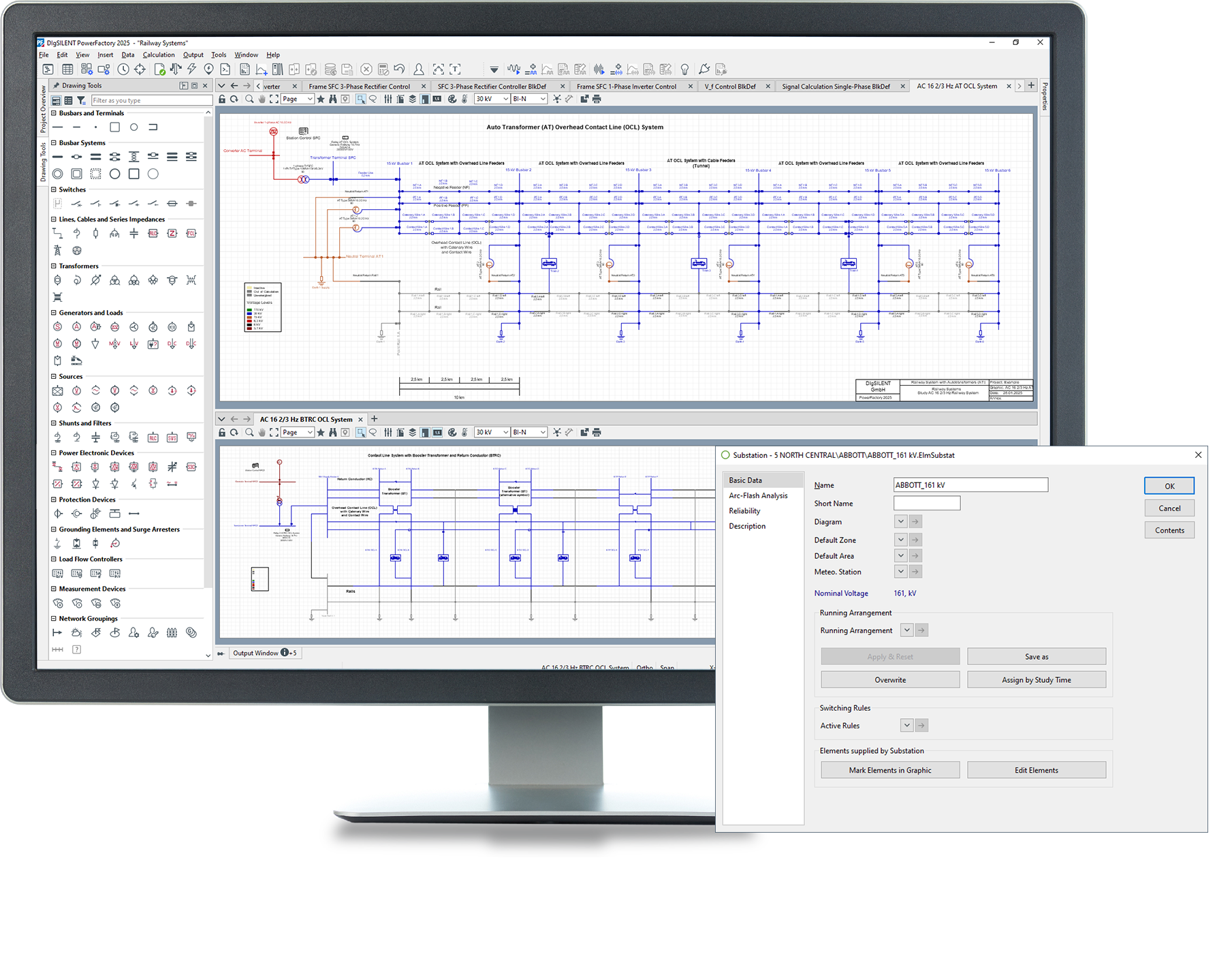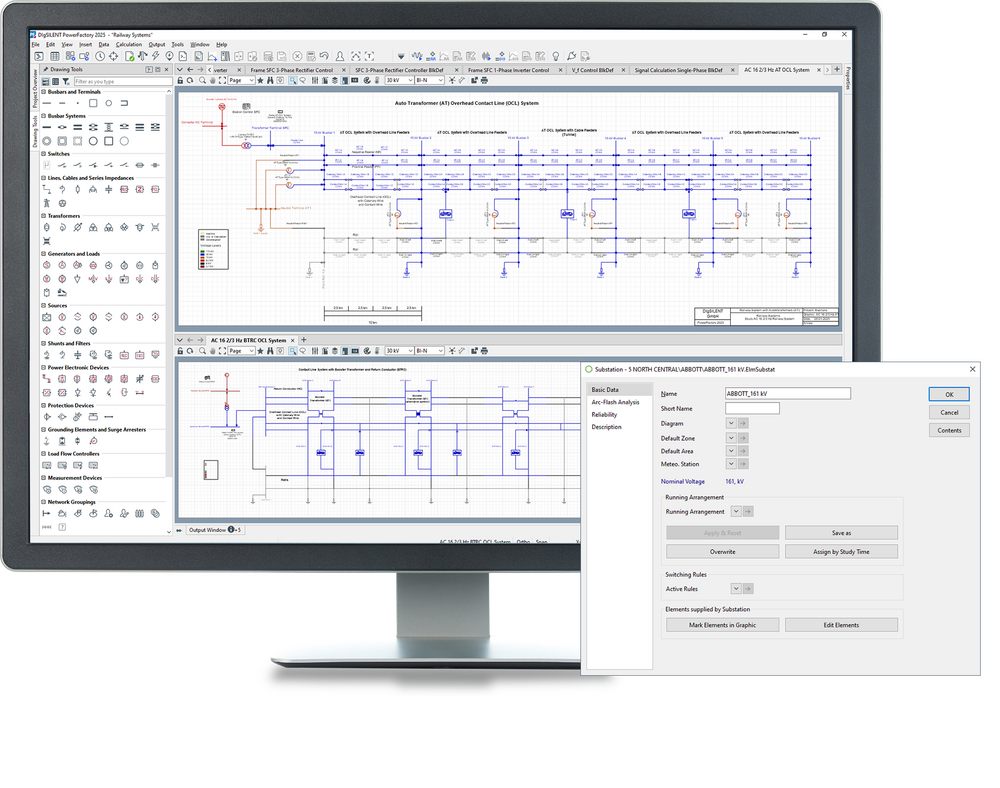 PowerFactory supports all network representations and phase technologies, i.e. any kind of radial and meshed 1-, 2-, 3- and 4-wire (combined) AC and DC network. Standard substation models are provided, as well as site and bay representation.