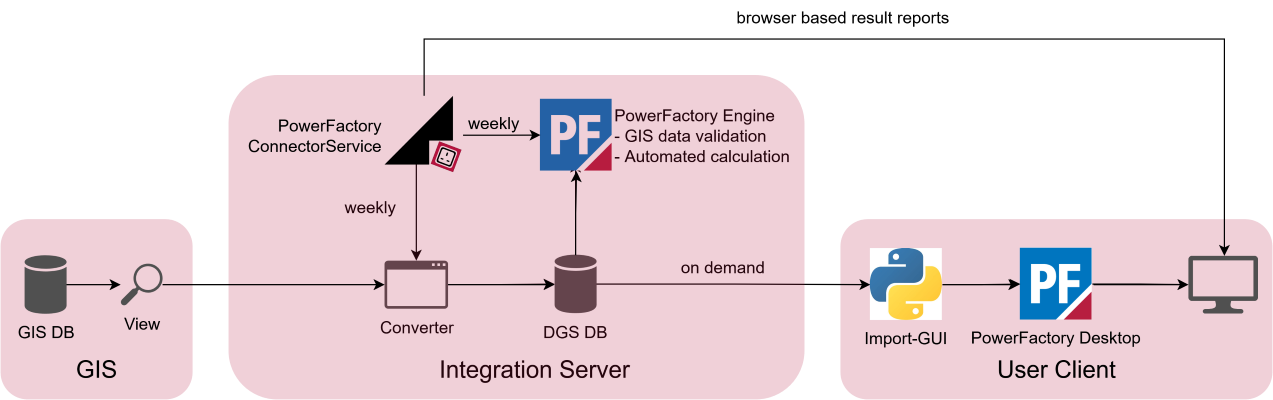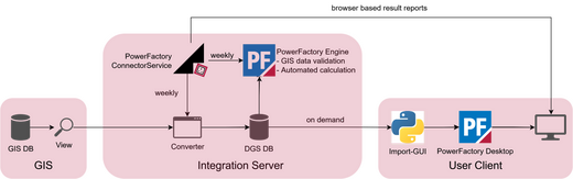 In the solution developed by DIgSILENT, GIS is the main source for the topology of the network model. If the GIS cannot provide all data needed for calculations, other systems can be added to enrich the data from GIS and merge it to the network model. The data flow is from GIS to PowerFactory. It is not possible to transfer data back to GIS.