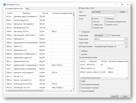 In PowerFactory, a GUI based on Python is provided to import the GIS data. The user can decide what parts are to be imported based on a list or a geographic map. Typically, one stand-alone part or one part and the adjacent parts (vertical or horizontal) are loaded. It is also possible to add parts to