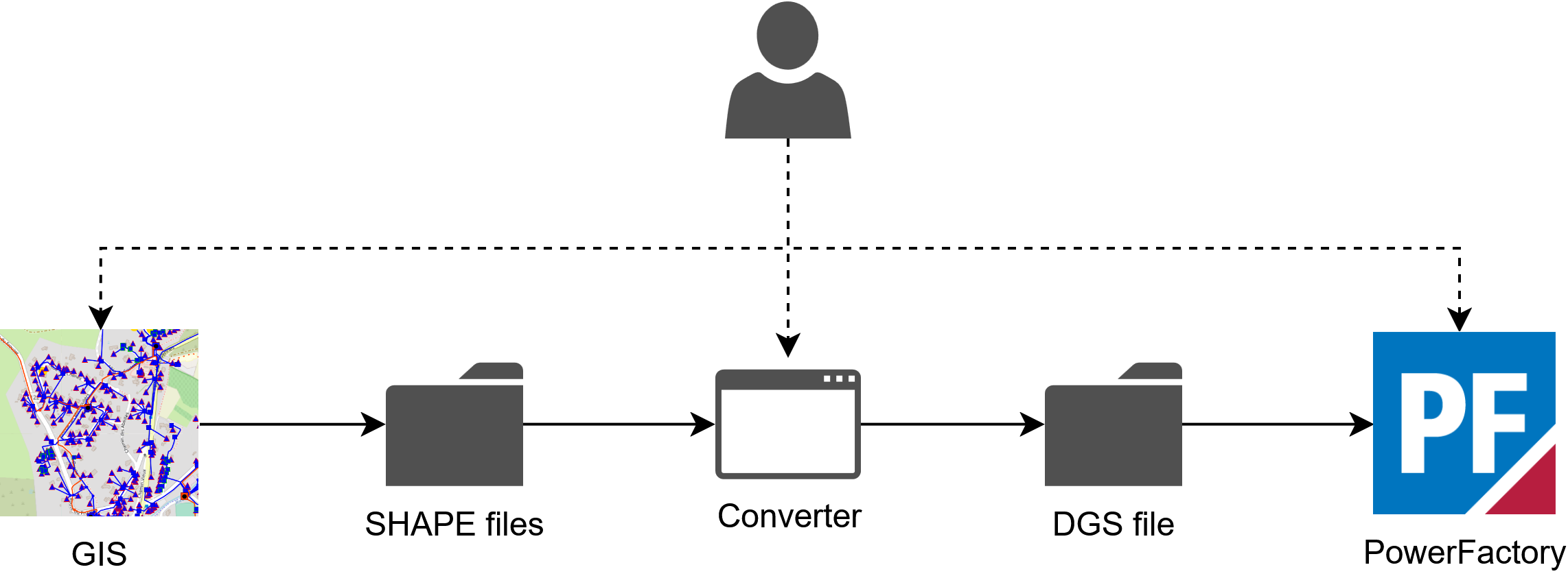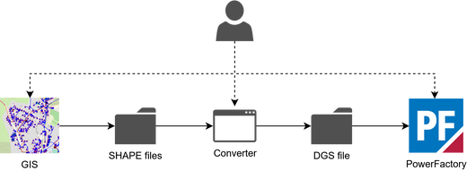 In the Standard Integration, the converter is started manually and uses the previously exported GIS data based on files. The converter supports various formats such as SHAPE and CSV. The output of the conversion process is a DGS file which can be imported by using the standard import function of PowerFactory.