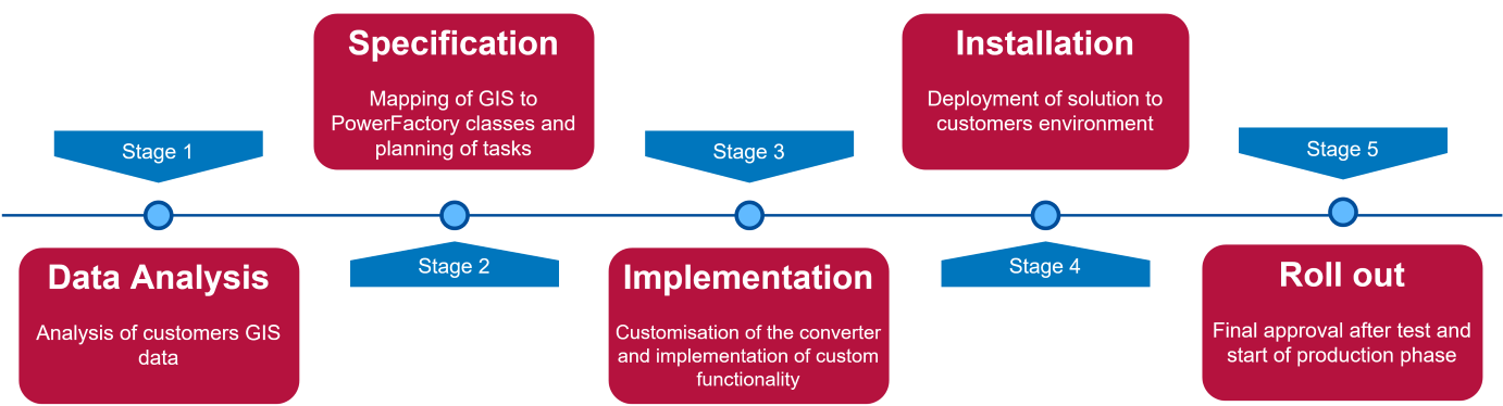 The converter reads the GIS data from the GIS database. A database view can be used to prepare the data. If the database cannot be used, GIS data based on a file export can be read by the converter. It is possible to join the GIS data with data from other sources in the conversion process. The converter creates an electrical and topologically connected network model that can be imported by PowerFactory. If required, data validation and topology corrections such as handling of isolated customers based on rules can be carried out.