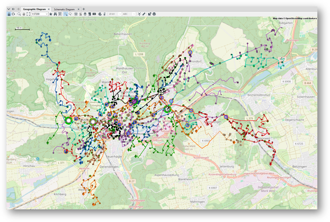 PowerFactory offers a wide range of functionality for representing a network model graphically. If geographic coordinates are used in the conversion, a geographic diagram is available for the overall network representation. In addition, automatically created station diagrams can be used to see the inner parts of a station such as transformers or switches. Schematic diagrams can be drawn automatically based on predefined feeders. Feeders are created in the conversion process at the beginning of lines in stations.