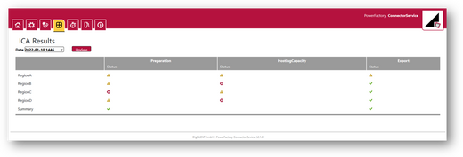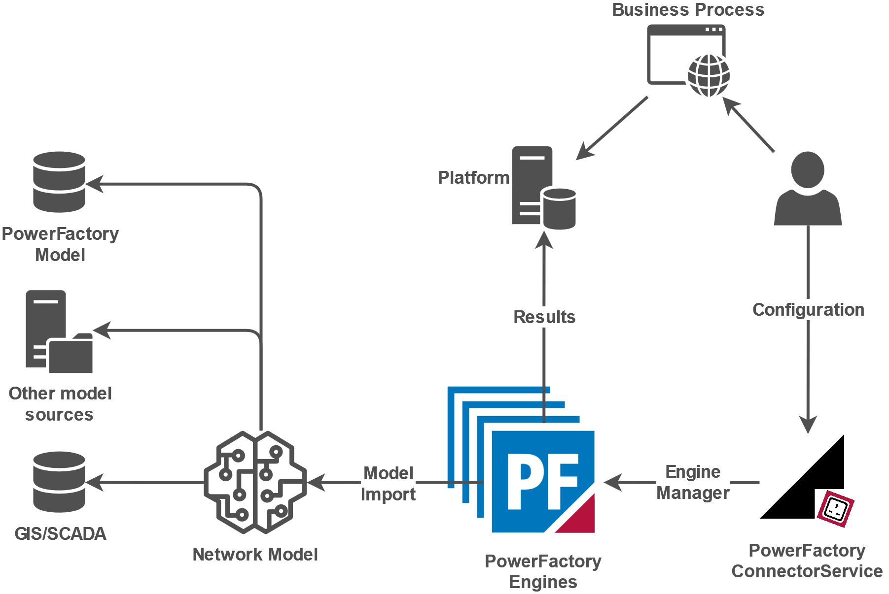In this solution PowerFactory provides the calculation functions. The solution, itself can be part of a business process of the utility using the results to deal with connection requests or to regularly verify the capabilities of the grid. Alternatively, the results can be provided directly in a web browser by the Connector Service.