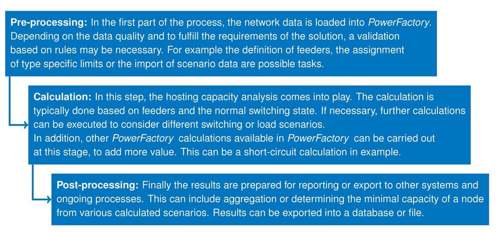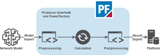The process within the solution consists of three steps: pre-processing → calculation → postprocessing. All steps allow individual configurations or extensions to meet customer requirements with minimal effort. As part of the post-processing, calculation results are provided for further business processes and integration into other systems. The network models and initial states can be versioned to rerun the automated calculations upon user request, for verification or regulation purposes.