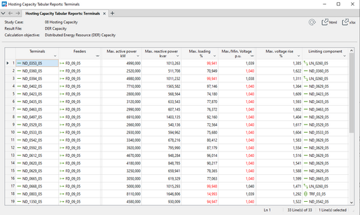 The results of the calculation are the maximum active and reactive power of additional generation or load is provided for nodes. In addition, the limiting component (node, line, transformer,...) is reported, as well as the violated constraint and other electrical quantities.