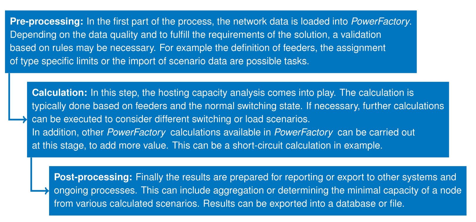 The basis of the solution is the standard function Hosting Capacity Analysis available in the PowerFactory module Distribution Network Tools. This function, which can be used for all voltage levels, provides fast evaluation of a network, combining load flow, protection and harmonic analysis. The ICA solution automates Hosting Capacity Analysis, so as to provide results with minimal intervention from the user, and enable multiple scenarios to be evaluated. Examples might include evaluation of different switch states or seasonal conditions.