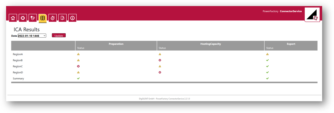 The ICA solution consists of PowerFactory engines running the calculations on servers without a graphical user interface. The number of engines depends on the size of network models and the frequency of the calculations. The calculations can be carried out on a regular basis or whenever the network model changes. The engines are controlled by the Connector Service. This is Windows service offered by DIgSILENT, to schedule and monitor tasks. The service uses the powerful API of PowerFactory to provide access between all elements, functions and external tools.