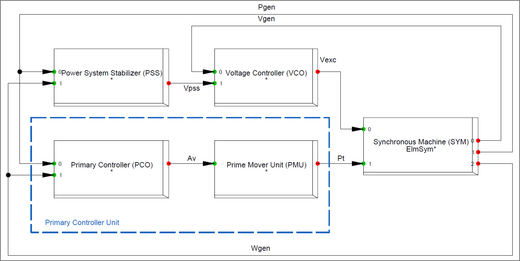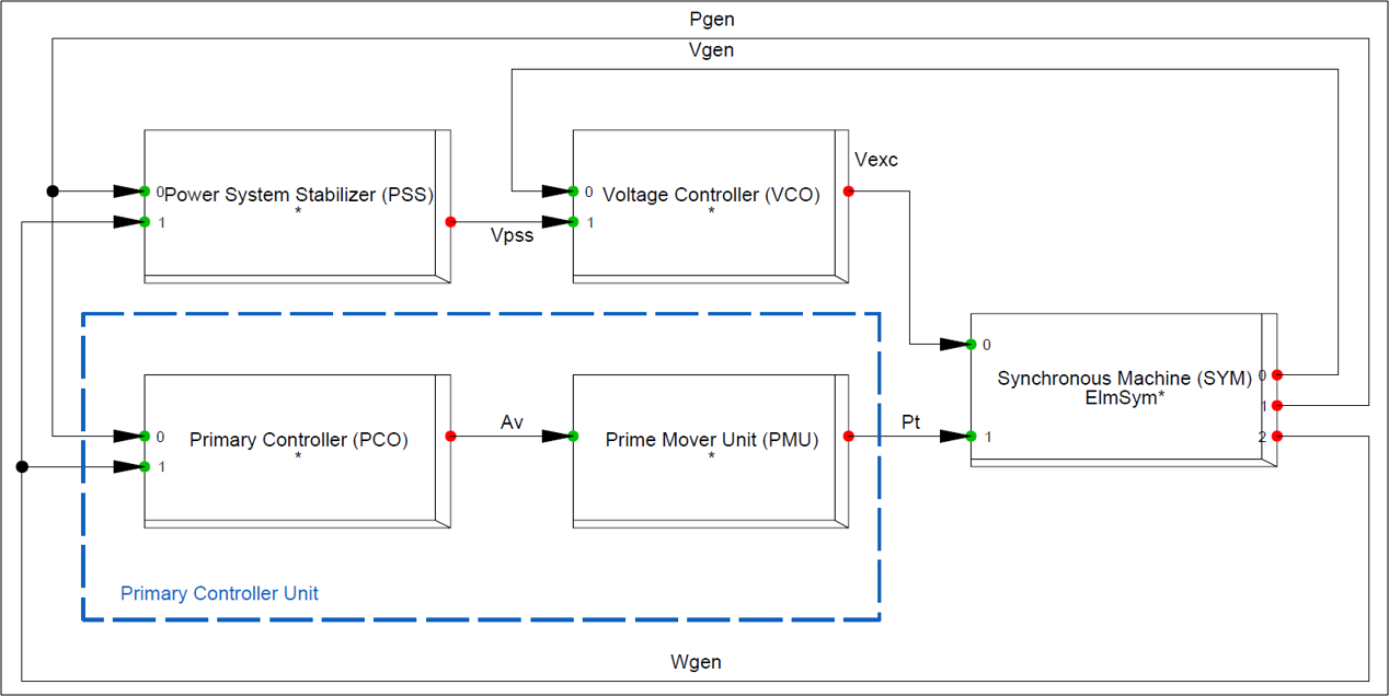 Composite Model Frames are diagrams that define the connections between dynamic models and network elements. They can be created graphically by using elements such as slots and signals from the drawing toolbox. A simple example for the high-level control system diagram of a synchronous generator is shown in Figure 5.