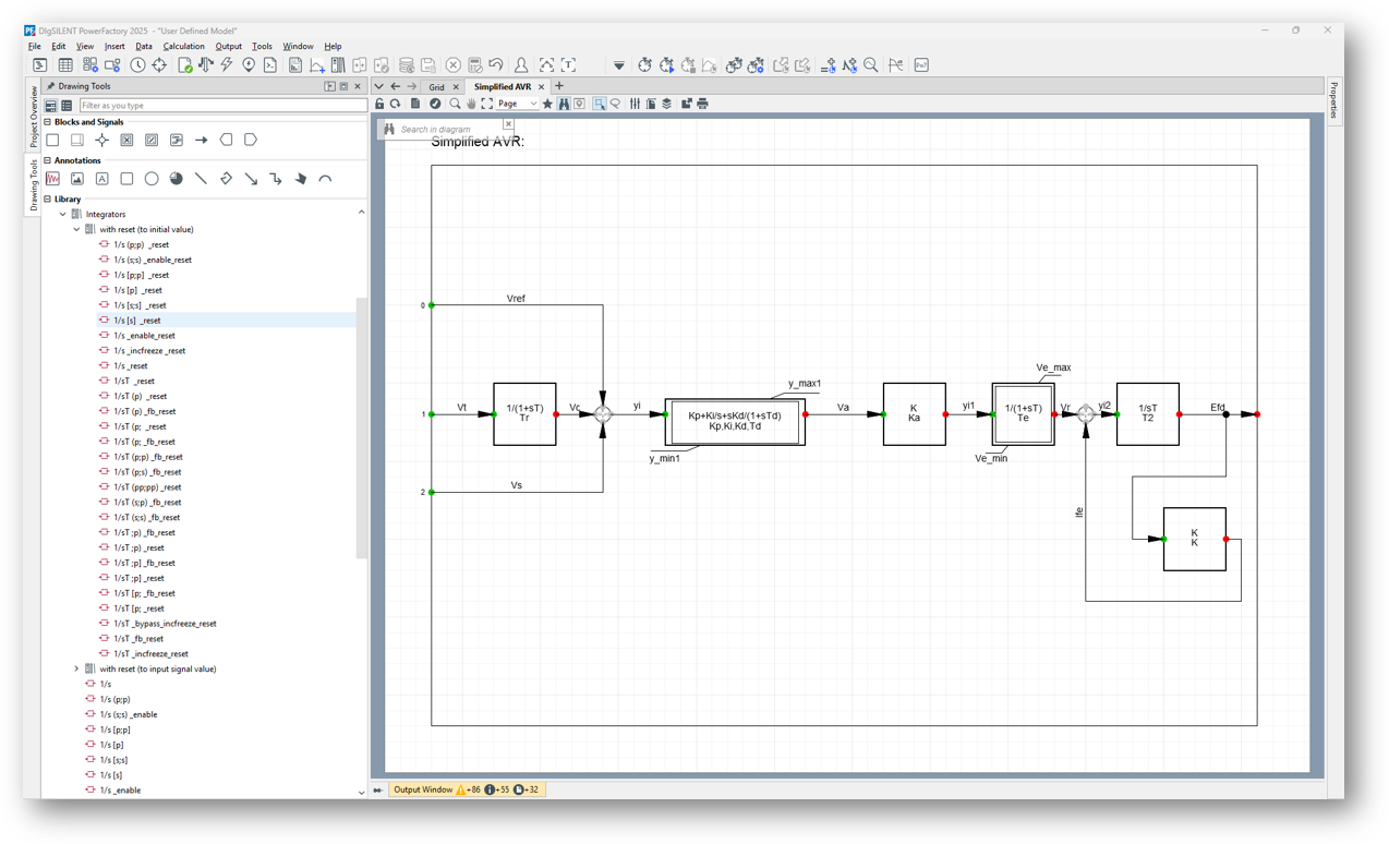 Non-linear time-continuous control models can be created either text-based by entering DSL code or graphically using block diagrams. PowerFactory includes a large set of DSL macros useful for most common controller elements, e.g. PIDcontrollers and dead-bands.