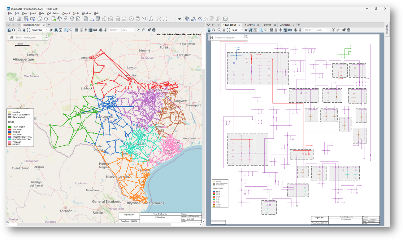 Network models can be visualized either schematically or geographically. An element can be represented in several diagrams and it’s possible to easily switch between the different representations. Fruthermore, multiple diagrams can be opened at the same time and organized by means of tabs or in vertical or horizontal groups.
