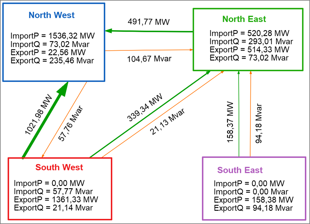 This option generates an interchange diagram, which shows the power flows between defined parts of the network. Interchange diagrams consist of customisable result boxes (the user can select which results to display) for those regions, and arrows showing power flows between the regions. The thickness of each power arrow indicate the relative size of the power interchange.