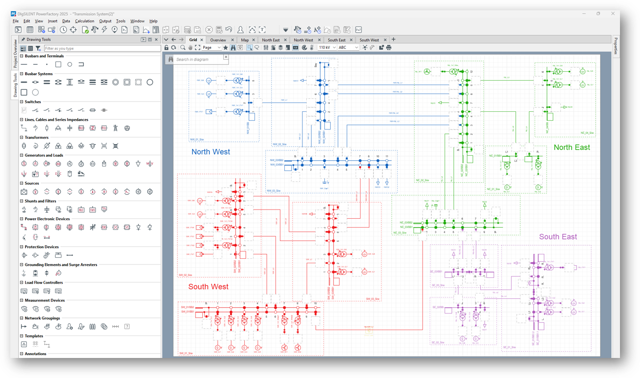 Schematic diagrams can be used to visualize the network model. Creating or updating an existing power grid model can be done graphically. A toolbox shows the symbolic representation of the various element classes, enabling the user to add selected elements to the diagram using drag and drop and then configure the new elements as required. Grouping objects such as feeders, areas and owners can be used to group network components. They can be defined graphically and visualized in network diagrams.