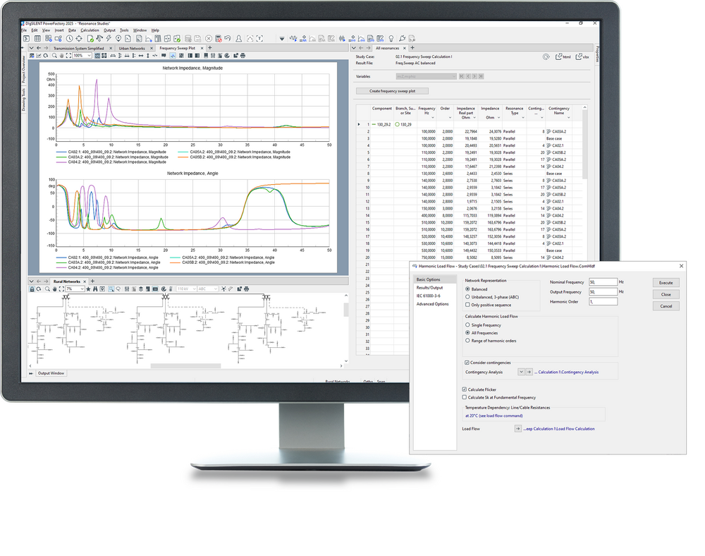 With the Harmonic Load Flow Calculation and the Frequency Sweep Calculation, the user is able to analyse a network in the frequency domain. Contingencies (unplanned outages) can also be taken into account. The module also includes Flicker Analysis and Filter Analysis functions.