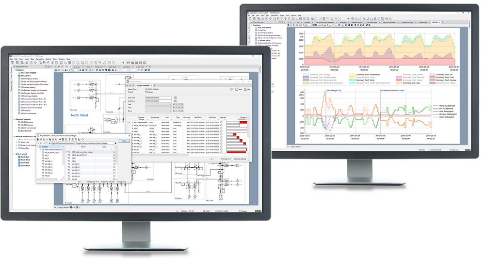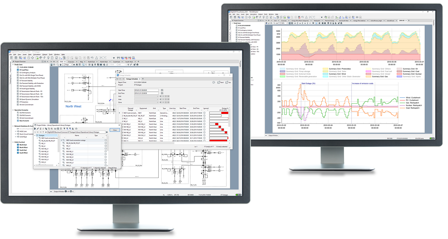 PowerFactory offers a complete suite of functions for studying large interconnected power systems and addressing these emerging needs. Its fast and robust simulation algorithms can be applied to any AC or DC network topology and support the simulation of new technologies such as converter-based power generation, FACTS, voltage-sourced converters (VSC), HVDC, cables and overhead lines, DC breakers, filters, and various types of power plant controllers and virtual power plants.