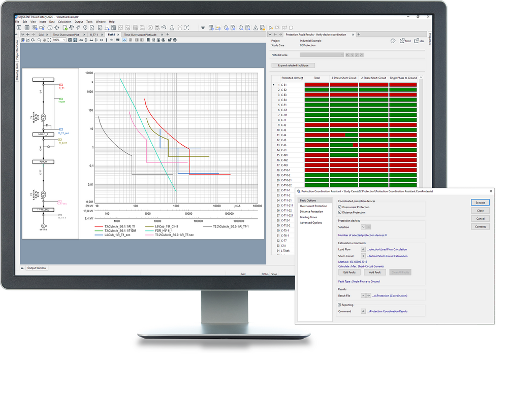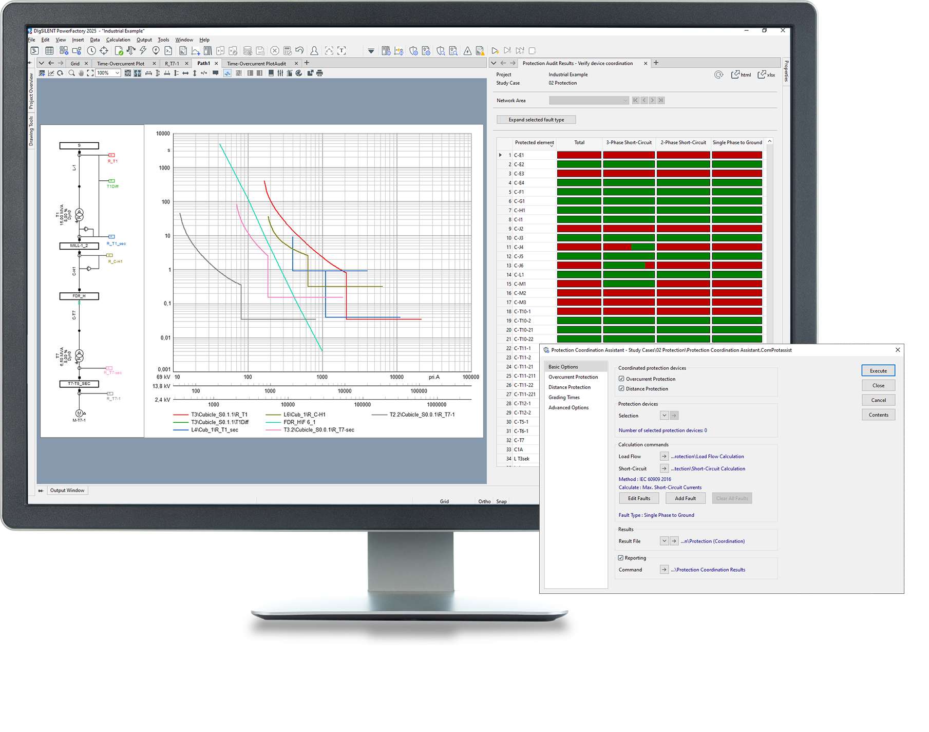 A range of protection concepts is supported, including time-overcurrent, distance, differential, directional, over-voltage and under-voltage, over-frequency and under-frequency, out of step protection and power swing blocking. Various graphical representation of protection device characteristics are available such as Overcurrent-time diagrams with drag and drop functionality, R-X and P-Q diagrams, and diagrams for differential protection. Validation of selected settings can be done graphically via Time distance diagrams or with Overcurrent-time diagrams, or automatically via protection audit tools. Selected settings can be reported in tables and exported for further investigation.