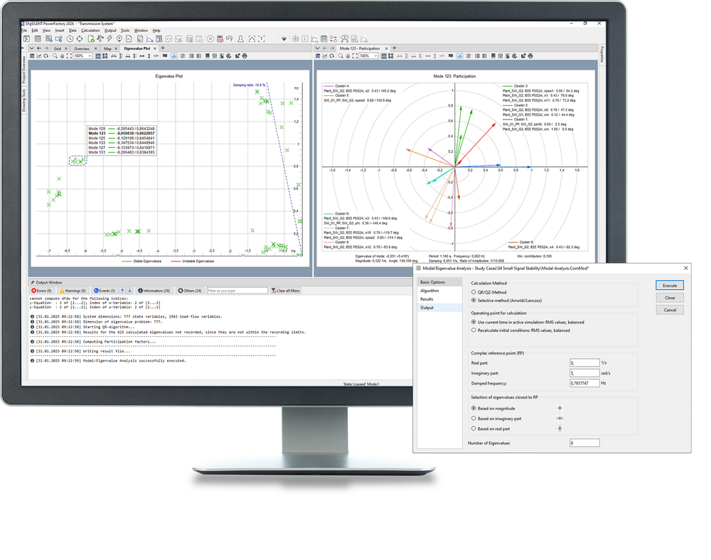 PowerFactory’s Small Signal Stability Analysis module provides an eigenvalue analysis tool that is suitable for both balanced and unbalanced network representations. The calculation can be configured to consider all modes of oscillation in the system, or to perform a selective analysis (especially useful in large networks). It considers not only conventional generation, but also non-conventional generation such as wind turbines, PV systems and HVDC systems. The results can be visualised in eigenvalue plots or tabular reports, including all relevant information such as frequency of oscillation, damping and damping ratio. The participation factors of the state variables, observability (right eigenvectors) and controllability (left eigenvectors) can be visualised in bar and polar plots.