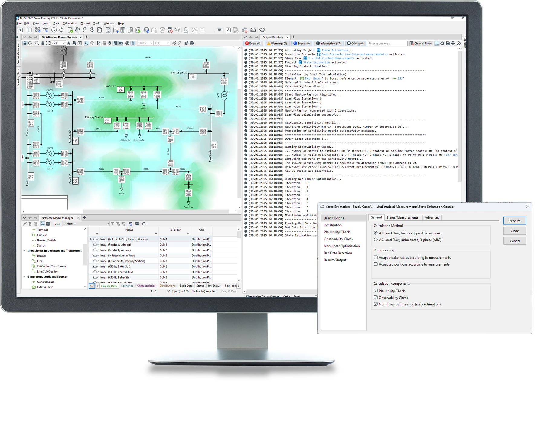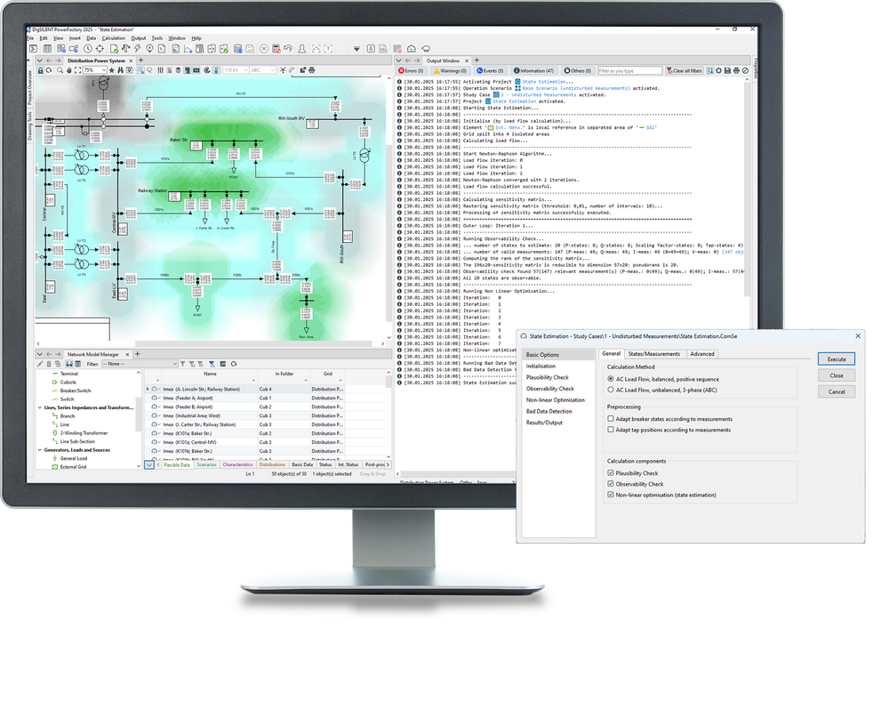 State estimation is a method for determining the most likely state of a network based on measured data and network topology. The State Estimation in PowerFactory is available for both balanced and unbalanced networks and includes a plausibility check to eliminate bad data as well as observability analysis to verify if the measurements in the system provide enough (non-redundant) information to estimate the state of that part of the network. Options for the treatment of unobservable areas allow estimation of the network state to be improved.