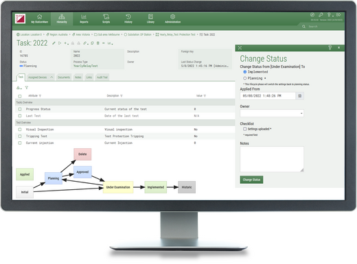 Every process type can be equipped with a fully-configurable workflow lifecycle. Processes and tasks can be connected to devices and settings to indicate correlation. Examples of processes include maintenance, commissioning, cyclic protection tests, and arc-flash label creation. The latter process can be carried out in StationWare using specific arc-flash process lifecycles, reports, and scripts. Calculated arc-flash label parameters can be imported into StationWare from PowerFactory. Business process management contains the same features as settings management including email notifications and audit trail support.