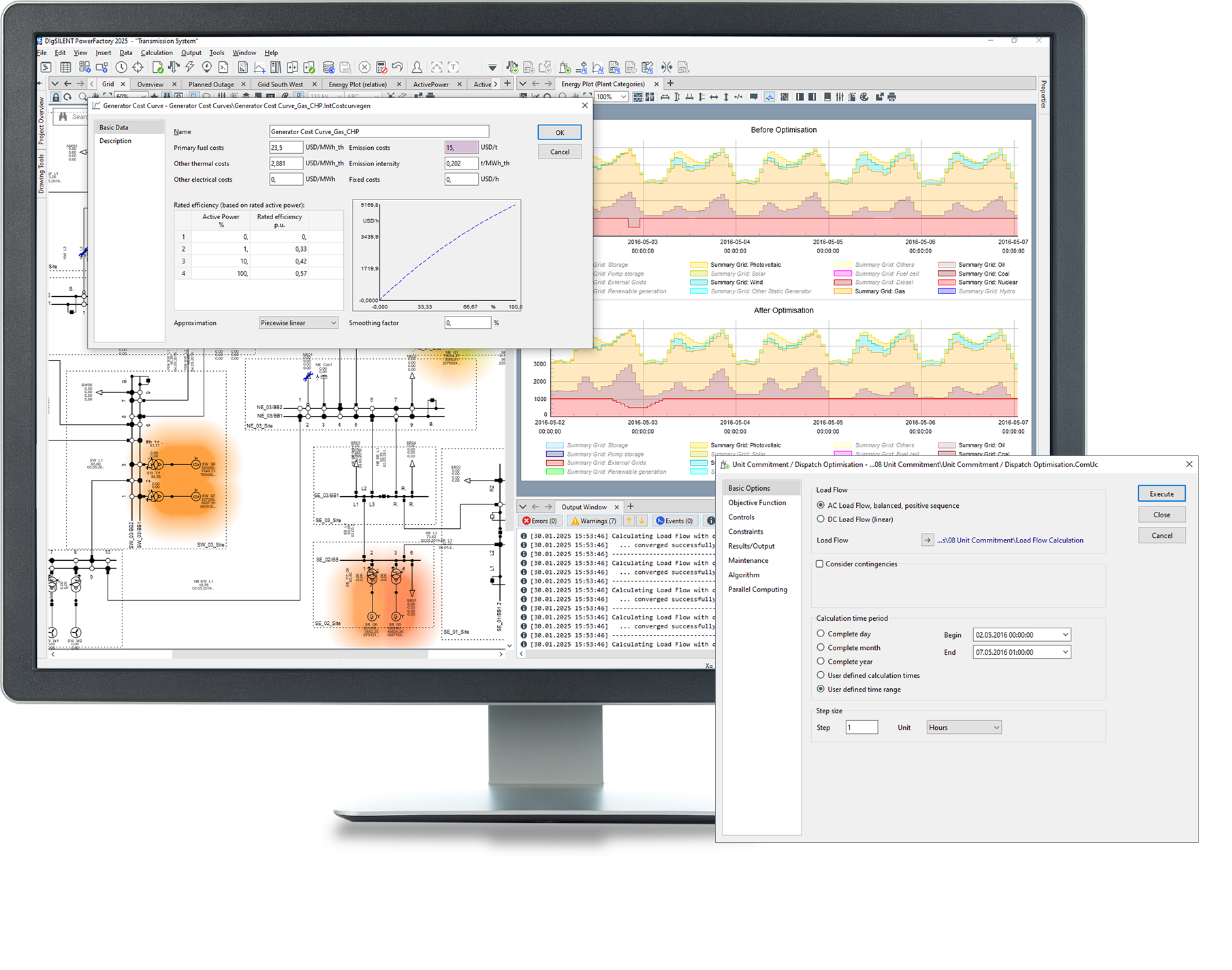 The Unit Commitment and Dispatch Optimisation tool allows users to easily complement traditional network simulation with a market simulation, without any need for an external tool. The module solves the unit commitment linear-programming problem over a predefined period of time, while optimising the operating point of the dispatched generators such to minimise overall operating costs. Hence it smoothly combines the functionalities of a Quasi-Dynamic Simulation, Optimal Power Flow and Contingency Analysis. The function supports both internal and external LP-solvers such as IBM CPLEX and GUROBI, thereby allowing the integration of existing LP simulation environments into PowerFactory.